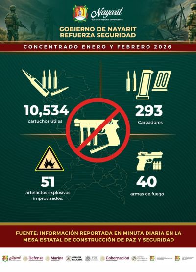 En enero y febrero, en Nayarit se aseguraron armas, municiones, vehículos y artefactos