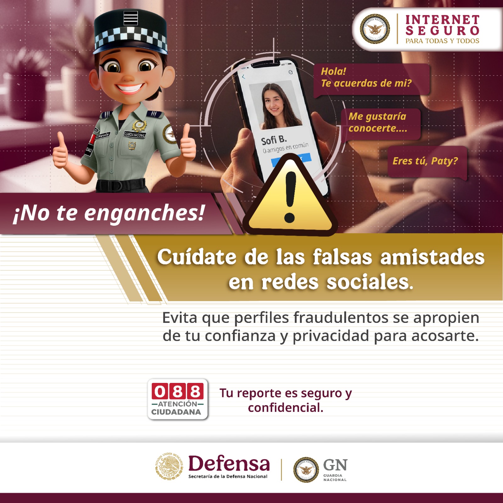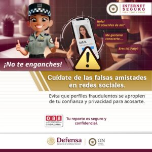 La Guardia Nacional te invita a reforzar tu privacidad en redes sociales ante falsos perfiles que ganan tu confianza para afectar tu integridad y reputación.